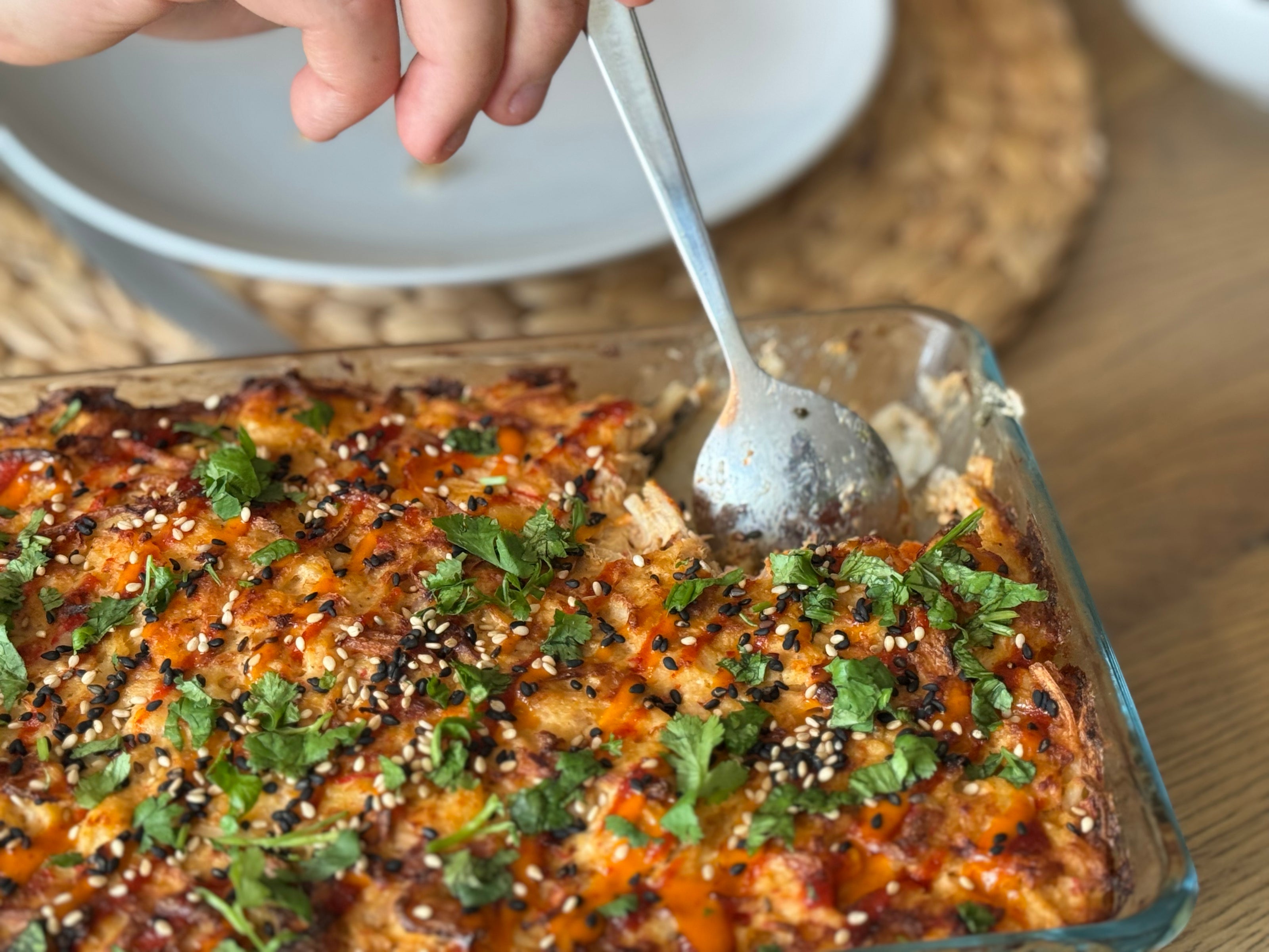 5. Finish and Serve: Drizzle Sriracha and spicy mayo over the baked dish. Garnish with chopped cilantro and black and white sesame seeds.